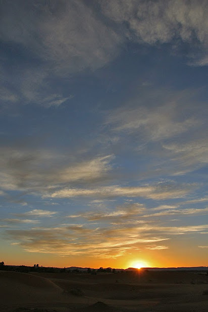 Y entonces me doy la vuelta y: sorpresa! resulta que mis colegas han venido conmigo! Alargamos la excursión para pisar la arena naranja y ver el obligado atardecer en las dunas. Nos alcanza también Mubarak y se une a la expedición. Otro jarro de agua fría: ya no está la puerta del desierto a la entrada de Merzouga, que la han quitado!!!